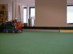 När bilen sedan vänder runt 180o borde den stå nästan rakt framför pallen längst till kanetn på den egna planhalvan.